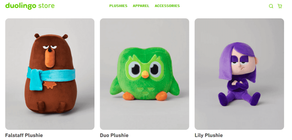 Duolingo taps into merchandise marketing to help Duo transcend the Duolingo logo into the real world. From plush toys to clothes and accessories, there is variety that caters to different user preferences and allows fans to integrate Duo and other Duolingo characters into their everyday lives.