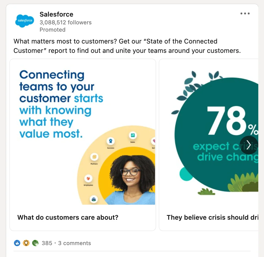 If you have a story to tell, need space to describe a product in detail, or showcase reviews, then a single image won’t do. And that is when you use Carousel ads on LinkedIn. Carousel ads allow you to upload two to ten cards to promote your product or service on the platform.
